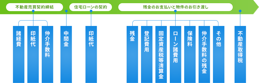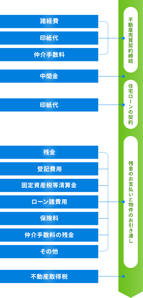 | ローン諸経費 | ・ローン事務手数料…ローンを申し込む際に必要となる費用 ・ローン保証料…連帯保証人を立てる代わりに必要となる費用 ※いずれも金融機関、借入期間等によって異なります。詳しくはお問い合わせください。 |